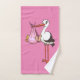 The stork is bringing the baby girl. Bathing towel with a colorful illustration of a stork that delivers a baby girl. Ideal as an announcement for a birth or a gender reveal party. Or just like a nice gift.