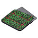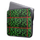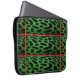 Green and black leopard skin laptop sleeve, with red stripes, across and down.