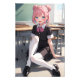 A girl sits on the floor in front of the desks in her classroom, smiling sweetly. Her big blue eyes sparkle in the morning sunlight. She wears the common school uniform: white shirt with black jacket and black pleated skirt. She completes the outfit with white socks that reach above her knees and black patent leather shoes. Her particular pink hair is tied up in a high bun adorned with a cute conical bun, fastened with hairpins on each side. A few strands of her hair flow gracefully down the sides of her face, giving her a fun, youthful air.