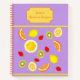 With soft painting illustration of delicious summer fruits, this adorable recipe notebook helps avid cooks organise their best recipes. The front cover features custom text field and cute drawings of colourful lemons, oranges, kiwis, spoons, and strawberries on a light purple background.