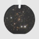 A massive galaxy cluster, about 4.6 billion light years away. Along its borders four bright arcs are visible; these are copies of the same distant galaxy, nicknamed the Sunburst Arc. The Sunburst Arc galaxy is almost 11 billion light-years away and the light from it is being lensed into multiple images by gravitational lensing. The Sunburst Arc is among the brightest lensed galaxies known and its image is visible at least 12 times within the four arcs. Three arcs are visible in the top right of the image, the fourth arc in the lower left. The last one is partially obscured by a bright foreground star, which is located in the Milky Way.
