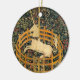Ornament featuring the mediaeval tapestry The Unicorn in Captivity (1495-1505). The seventh tapestry in The Unicorn Tapestries—also known as The Unicorn Rests in a Garden—shows a white unicorn with a blue collar sitting inside a fence. Green grass and beautiful flowers surround the unicorn. A fantastic gift for mediaeval art collectors and fantasy lovers!