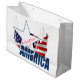 American flag in the shape of the USA map, white star with blue outline, red and blue text The Unites States Of America. The Independence Day and other occasions patriotic gifts and souvenirs for anyone. Large gift bag. Customisable. You can change the image. Enjoy!