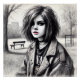 A young girl with an intense and melancholic look, dressed in a leather jacket and a Nirvana t-shirt, sits in a desert park. Its dark makeup and curly hair accentuate its rebellious and lonely look. The whole is designed in a vintage style.