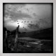 Standing in mountain field at night. Leaning on a rustic, weathered wooden fence. Out over the trees a flock of Canadian Geese head south flying in chevron formation before a full moon. Summer has ended. Black and white landscape photography by Bob Orsillo