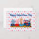 Here comes the Valentine train. This cute trio, an elephant a hippo and a giraffe are passengers on this adorable train. The background is a subtle polka dot pattern. All text on the front can be customised. NOTE: Cards are left deliberately blank, on the back, so children can sign their name.