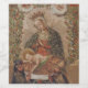 This beautiful painting is based on The Virgin Adoring the Christ Child with Two Saints (La Virgin adorando al Niño Jesús con dos santos) by Unidentified artist. Original public domain image from Los Angeles County Museum of Art. The artwork features a crowned Virgin Mary, with a serene expression and hands clasped in prayer. She is dressed in rich robes with intricate patterns, surrounded by radiant golden lines. Below her rests a sleeping baby Jesus, surrounded by a blanket with detailed designs. Two holy men are positioned beneath, the sacred heart between them. The background is filled with floral motifs and cherubs within clouds.