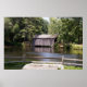 A rustic covered bridge spans a calm pond, surrounded by lush greenery and tall trees. A wooden fence and large rock in the foreground add a pastoral touch to the serene landscape.