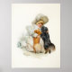 The Welcome Home. A little girl, all dressed up in her finery, with her feather hat and fur coat, is greeted by her two dogs. She is kneeling down and hugging them, as they lick her face with joy. Vintage illustration by Harriett Bennett.