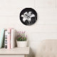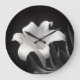 This close up features a white lily on a green stem with a backround of black. The lily and part of the stem is photographed with a light. This is photographed in black and white. This clock will look great through the spring and summer months.