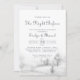 This winter night before rehearsal dinner invitation is perfect for a rustic wedding rehearsal celebration. The design features a hand-painted forest on hills and mountains in an idyllic winter scene.