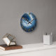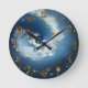 Somewhere in space a blue planet resembling Earth sits in a swirl of clouds. Yellow stars glow on the blue space background. Golden numbers mark each hour on this space fantasy wall clock.
