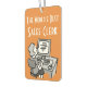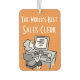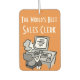 Office Worker Car Air Freshener. The World's Best Sales Clerk. Orange background.