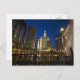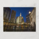 A dusk view of Chicago's Wrigley building from the riverwalk.