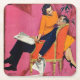 Artist:Morgan Kane | A man is lounging in a bright red chair reading the newspaper, and a woman is sitting on the arm