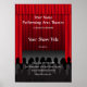 A graphic illustration of a theatre stage with red curtains on a Performing Arts Stage Show Poster. Original artwork: Copyright Charmaine Paulson