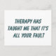 Therapy has taught me that it's all your fault - Funny one liner about blaming others. Why take the blame when you can easily blame others? Humourous saying.