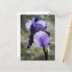 A photograph of a new purple Iris flower blossom. The background is a boulder in the garden.