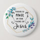 There is Power in the Name of Jesus Button. Button pins are a great way to show your support for your favorite cause or team. This Christian button pin features a blue floral wreath and the words "There is Power in the Name of Jesus." Show your faith with this stylish pin!
