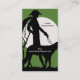 A stylish art deco fashion silhouette of woman and dog set against a bright white moon, soft-coloured background with black silhouette.