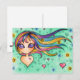 A post card featuring a coloured pencil traditional illustration of a girl with large purple eyes floating on a teal green background. Her lovely long hair flows to the right and is made up of blue, pink, purple and yellow strands making it seem like a rainbow. Around her there are stars and hearts scattered.