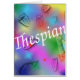 "Thespian" ... you know what it means ... do they? This card features a rainbow coloured background with comedy and tragedy masks.