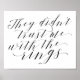 Simple Elegant Calligraphy Script Wedding They Didn't Trust Me with the Rings Ring Bearer Processional Sign in beautiful flowing fancy letters and your personalized names. A stylish yet simple formal design in black and white or any background color you choose. Just click the customize further link, shown under the text personalization area on the right, and choose your custom color background. This sign poster template makes it fast and easy to create stunning additions to your wedding decor. Signs can be enlarged, there are many sizes to choose from, as well as options for custom framing and matting. wedding custom signage.