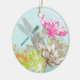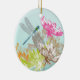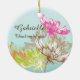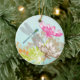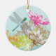 The dragonfly is in shades of blue and green. The graphic flowers are in pink, lime, light chocolate brown in the gradient of lime. The back of ornament is just flowers and dark chocolate brown texts which are customisable. This is a digital illustration.