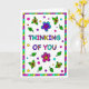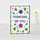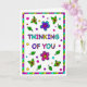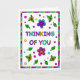 Cute colourful whimsical hand drawn Thinking Of You greeting card for a friend or family member. Inside is a bonus colouring page.