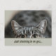 Let this cute little grey cat cheer your friends and let them know you are thinking about them, or just checking in on them... Add the caption you like! Light sage green background with dark sage green font and accents. - Special note: Use the drop down menu under "Personalise this template" to type in your message and the name and address of the recipient, or delete the information in those fields if you prefer to hand write the message and address.