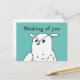 This postcard features a cute owl saying, "Thinking of You", against a blue green background. I drew this little owl in pen. See my store for more owl gifts.