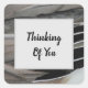 A photo of duck feathers adorns this "thinking of you" square sticker creating horizontal stripes of feathers. The grey and black bird feathers add a touch of nature and a unique abstract element to this inexpensive sticker. "Thinking of you" appears inside a light grey square. All text can easily be customised to suit your needs.