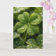 A close-up image showcases a green clover leaf adorned with sparkling raindrops, illuminated by the fresh morning light, which highlights the leaf's intricate details and texture.