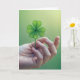 A hand delicately holds a four-leaf clover against a soft, blurred green background for thinking of you.