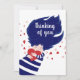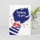 Thinking of you girl holding red heart cute illustration with hearts and stars. Let your friend know about your fillings with this adorable modern card.