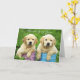 Who can you resist the cute face of a Labrador Retriever puppy dog? This sweet greeting card features two yellow lab puppies playing in purple and blue pails in a green grassy field.