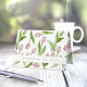 The product design features a pattern of pink tulip flowers. This botanical illustration with personalised text makes modern chic and unique greeting cards - THINKING OF YOU.