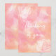 A pink and orange patchy design with text on the front saying "Thinking of you" in cursive writing. Front of hard has two faded rose outlines.