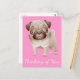 Aww...Who can resist the the sweet face of a Pug pup? This Postcard features a cute cartoon graphic of a brown and tan pug puppy dog highlighted against a pink background. This adorable little pup is ready to help you tell friends and family that your are thinking of them.