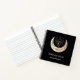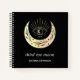 Chic and elegant notebook featuring a faux gold foil holographic illustration of a third eye over crescent moon decorated with leaves on a magical black colour background.