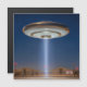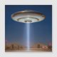 A flying saucer-shaped spacecraft hovering over a fenced military facility that is supposed to be zone 51 or area 51. A powerful ray of light descends from the center of the UFO towards the entrance of a restricted area, illuminating the starry night and the surrounding desert space.