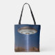 Shoulder note; Bag totes. A flying saucer-shaped spacecraft hovering over a fenced military facility that is supposed to be zone 51 or area 51. A powerful ray of light descends from the center of the UFO towards the entrance of a restricted area, illuminating the starry night and the surrounding desert space.