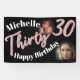 30 and Thirty glitter style effect script text in rose pink and sliver hues on black birthday banner. Personalise this 30th birthday banner with your own two photos ideal for a now and then photo opportunity of your birthday girl and add their name or a message. Other years and matching items are available. © Original design by Sarah Trett for www.mylittleeden.com on Zazzle.