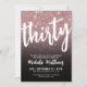 Celebrate the big 3-0 in style with this modern and festive 30th birthday party invitation. The design features a faux rose gold glitter background that fades into a sleek black gradient at the bottom, with the word "Thirty" boldly highlighted in elegant calligraphy at the top. A mix of script and clean modern fonts in crisp white creates a striking contrast that feels both chic and timeless. The back features a solid black background for a simple, polished finish. Perfect for honouring 30 years young, this invitation can be customised with your choice of font and background colours to suit any party theme.
