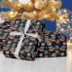 Wrap your gifts with "much wow" this holiday season! This elegant and adorable wrapping paper features realistic Shiba Inu dogs wearing cozy blue and white striped turtleneck sweaters. The pattern is accented with large, detailed silver snowflakes (printed effect) and festive red holly berries against a sleek black background.