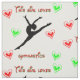 This girl loves gymnastics! This gymnast is doing a leap into the air surrounded by decorative font and red and green doodle hearts!