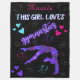 This Girl Loves Gymnastics - This design has a female gymnast silhouette covered in tiny hearts doing a back handspring step out skill! Above her is the words "This girl loves gymnastics" - "gymnastics" is in a purple neon glow effect font while the other words are in a two toned bubble like font. At the very top this blanket is personalised with the name of your child to make it truly her own! Loaded with colourful doodle hearts in pink, purple, white, and turquoise with two special silver hearts at the top surrounding the name of your gymnast!