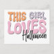 This playful and colourful design features the phrase "This Girl Loves Halloween" in bold, retro-style lettering. The text is divided into three lines, with each line having a distinct colour palette. The word "THIS" is in a soft, textured orange, "GIRL" in a pastel purple, and "LOVES" in a light, bubblegum pink. The word "Halloween" is scripted in a smooth, black cursive, adding contrast and balance to the design. Each letter has a slightly rounded, bubbly shape, giving the design a fun and whimsical feel, perfect for celebrating the festive and lighthearted spirit of Halloween.