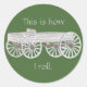 These fun, This is how I roll, stickers, feature my drawing of a rustic wagon. The wagon is drawn in shades of grey and tea brown. The text is also written in grey and can be customised with your text. The background shown is green and it can also be customised. Thank you for shopping CherylsArt on Zazzle.