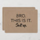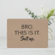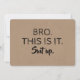 "Bro. This is it. Suit up. Will you be my Groomsman?" Funny proposal cards.